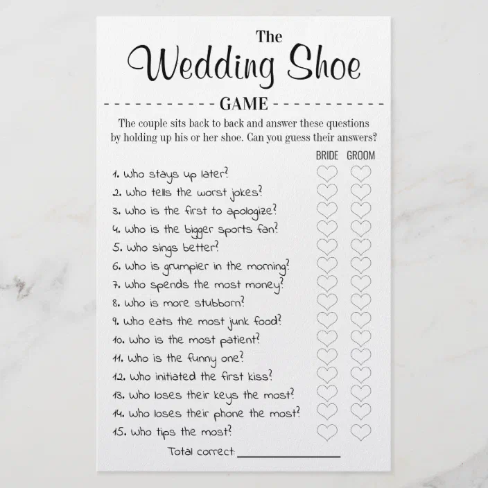 . We would like to show you a description here but the site wont allow us. Its good to get a mix of questions from each section although its best to leave out the naughty questions if the bride or grooms mums are in attendance. The wedding shoe game is popular entertainment during wedding receptions.
